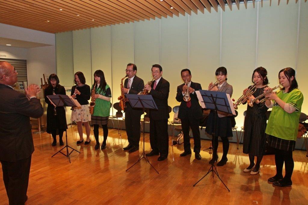 そして最後に、昭和45年度卒業杉山由展さん指揮の即席OBバンドによる「錨を上げて」「第一応援歌」「校歌」の3曲を演奏があり、「校歌」は急遽會津洋一会長のリーダーによる「校歌斉唱」へ変わり、予定の無いアンコールもありTb抜きの「マカレナの乙女」を何とか演奏し幕を閉じました。